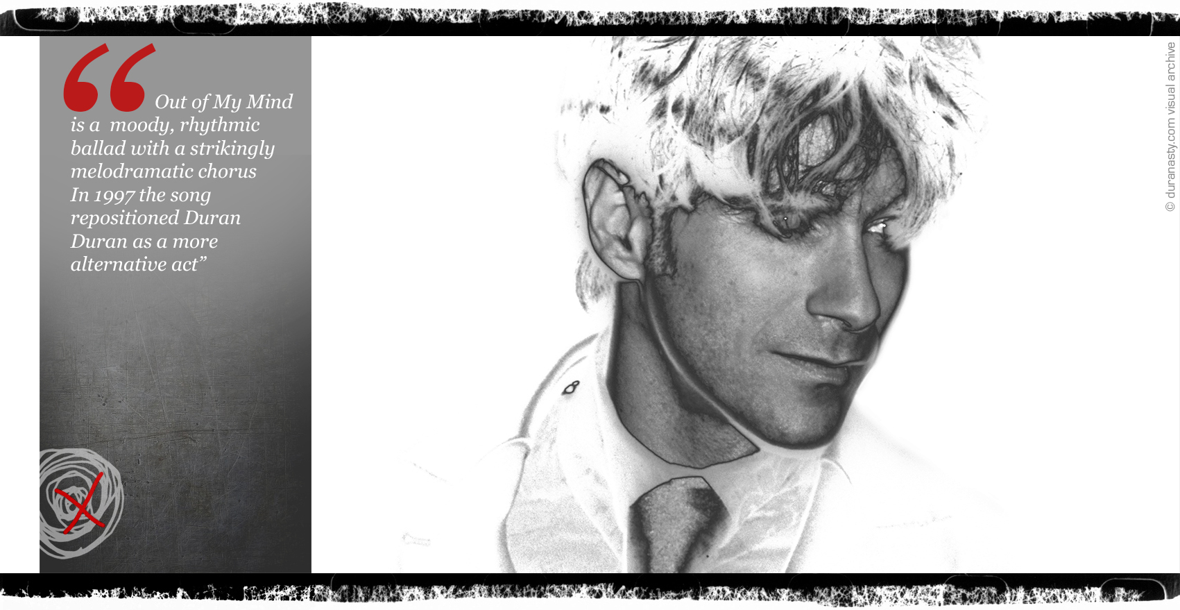 It's a song that I believe deserved more recognition. Today, on the 20th anniversary of the single release, duranasty.com pays tribute to this little gem and it does it in it's typical way, both, musically and visually... yes, visually because the video for Out Of My Mind is a piece of art... it's almost impossible to separete the song and the video. It's a rare case of perfect communion between the two things: sound and vision, if you like in the same way as Rio! You can't think of that song without seeing the image of the guys wearing their Antony Price pastel suits on the boat... likewise you can't listen to Out of My Mind without seeing the amazing goth imaginary that the video creates around the music. It's not just a case that the backcover of Medazzaland [album released in 1997 featuring Out Of My Mind], has a scribbled, roughly painted, version of the beautiful Nagel's Rio illustration.